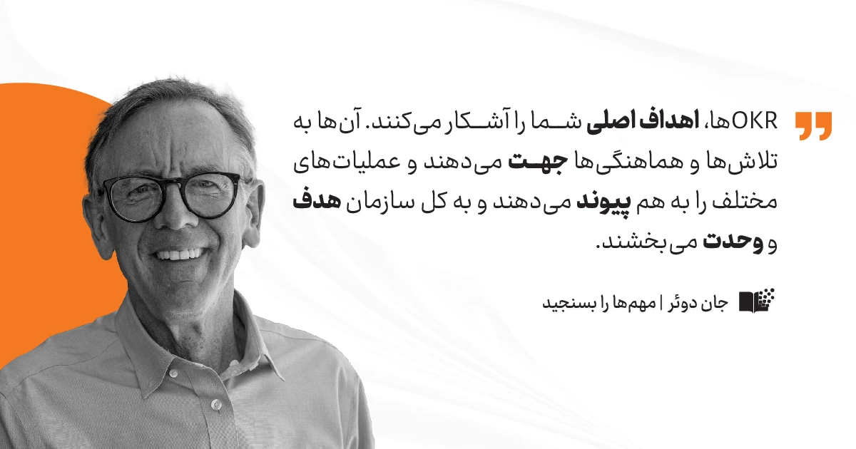 در بخش اول کتاب مهم ها را بسنجید می‌خوانید که سیستم OKR مخفف Objectives and Key Results یک ساختار و چارچوب مدیریتی است که به سازمان‌ها برای تعیین اهداف سازمانی و رسیدن به نتایج کلیدی قابل اندازه‌گیری برای پیگیری روند پیشرفت، کمک می‌کند. سیستم OKR دو بخش اصلی دارد: اهداف (Objectives) و نتایج کلیدی (Key Results).
