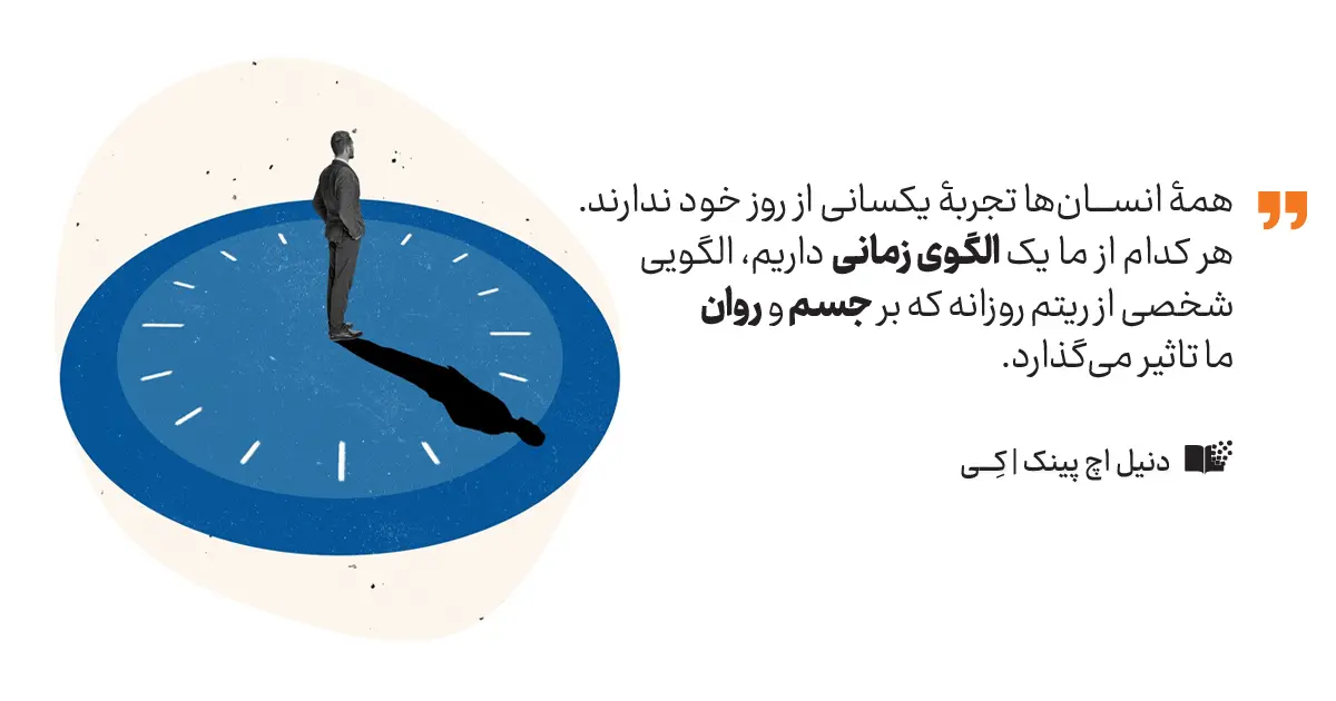 ما دائماً تلاش می‌کنیم زمان‌بندی درستی داشته باشیم، به ضرب‌الاجل‌ها برسیم و از وقت محدود خود بهترین استفاده را ببریم. بیشتر ما در طول هفته، از دوشنبه تا جمعه، یک الگوی احساسی ثابت را تجربه می‌کنیم که با ساعت روزانه‌مان هماهنگ است. این کتاب توضیح می‌دهد چرا کارهای خاصی را در زمان‌های مشخصی انجام می‌دهیم و چرا زمان‌بندی در عملکرد ما نقش مهمی دارد.